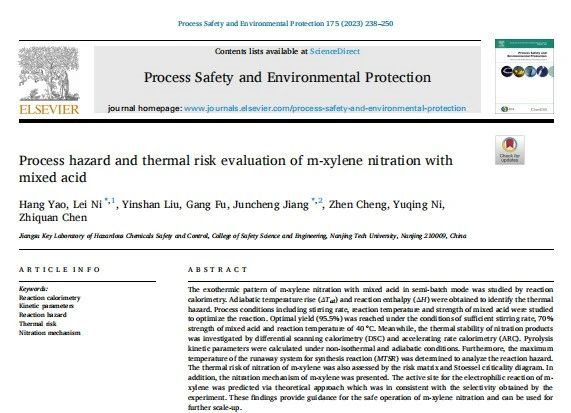 南京工業(yè)大學(xué)倪磊副教授團(tuán)隊(duì)在 Process Safety and Environmental Protection 期刊發(fā)表題為 Process hazard and thermal risk evaluation of m-xylene nitration with mixed acid 論文,該成果由國(guó)家自然科學(xué)基金項(xiàng)目(No.21927815, 51834007, 52274209) 支持。項(xiàng)目研究了間二甲苯混酸硝化工藝的過(guò)程危害及熱風(fēng)險(xiǎn)評(píng)估;其中仰儀科技絕熱加速量熱儀被應(yīng)用于對(duì)硝化產(chǎn)物的熱失控測(cè)試及動(dòng)力學(xué)分析,此外也對(duì)混酸硝化工藝的反應(yīng)風(fēng)險(xiǎn)進(jìn)行了評(píng)估。