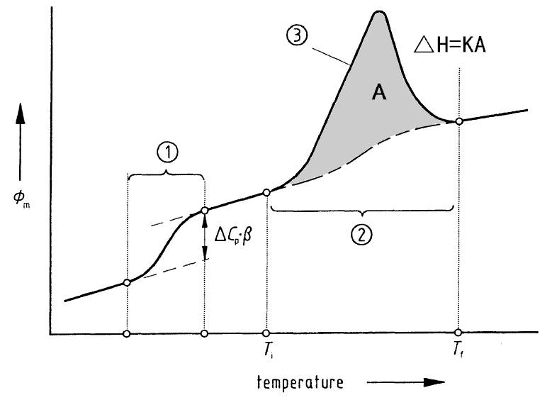②處虛線指的是基線?;€及峰面積的確定見下文詳解。這里的基線同樣是以臺階的形式出現(xiàn),可以認(rèn)為出現(xiàn)了熱容的變化。