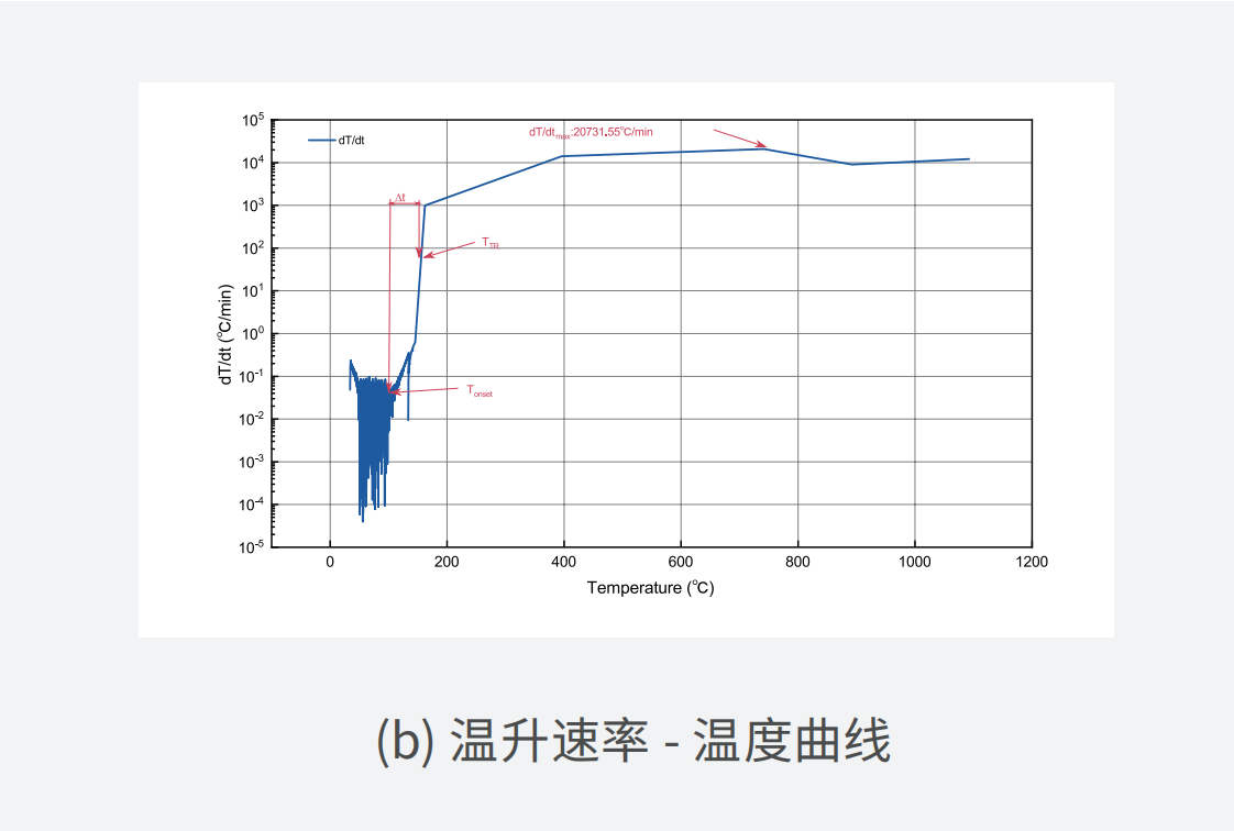 電池絕熱量熱儀(Battery Accelerating Calorimeter)在鋰電池單體熱失控測(cè)試中,能夠精準(zhǔn)測(cè)量鋰電池的自放熱起始溫度(Tonset)、熱失控起始溫度(TTR)、熱失控最高溫度(Tmax)、泄壓溫度(Tv)、最大升溫速率((dT/dt)max)和熱失控孕育時(shí)間(?t)等關(guān)鍵參數(shù)。為電池?zé)峁芾硐到y(tǒng)的設(shè)計(jì)提供數(shù)據(jù)支持,助力研究人員明確鋰電池的安全邊界,實(shí)現(xiàn)熱失控的有效預(yù)防與早期預(yù)警。
