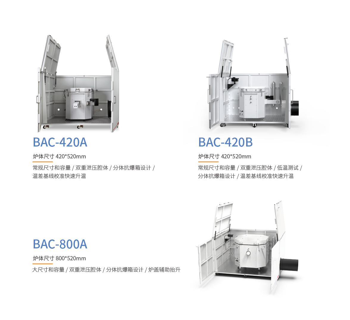 BAC系列采取專業(yè)結(jié)構(gòu)化提升、大功率元件加熱、智能化算法升級(jí)等創(chuàng)新方式,保障了高效的控溫性能。通過(guò)優(yōu)秀的結(jié)構(gòu)設(shè)計(jì)與系統(tǒng)集成,實(shí)現(xiàn)了量熱測(cè)試腔抗爆能力與密封能力的巨幅提升。