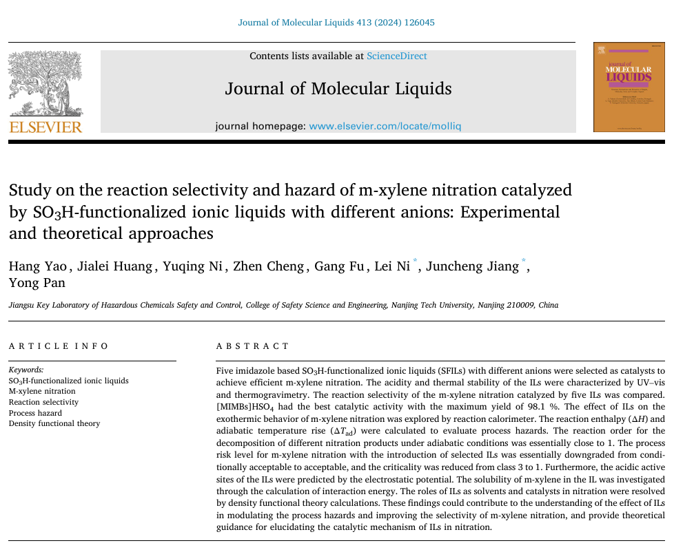 南京工業(yè)大學(xué)倪磊教授團(tuán)隊在 Journal of Molecular Liquids 期刊發(fā)了表題為 Study on the reaction selectivity and hazard of m-xylene nitration catalyzed by SO3H-functionalized ionic liquids with different anions: Experimental and theoretical approaches論文,該成果由國家自然科學(xué)基金委員會(編號21927815、52334006、52274209)和江蘇省“333”項目支持。