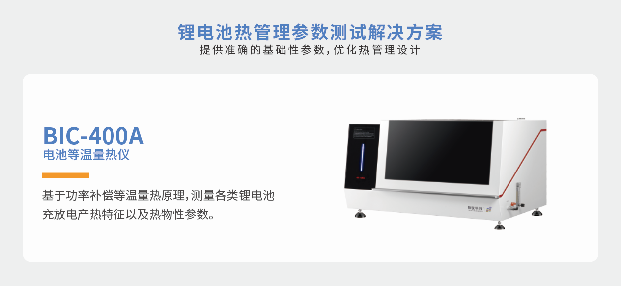 派能科技利用仰儀科技的BIC-400A 電池等溫量熱儀獲取不同溫度或不同倍率下電芯充放電過程中的吸放熱功率、吸放熱總量、最大放熱功率等熱特性參數(shù),為其電池?zé)?/span>仿真、熱管理系統(tǒng)優(yōu)化設(shè)計提供了有效數(shù)據(jù)支持。BIC-400A 電池等溫量熱儀具有小于0.1mW的基線噪聲,檢測靈敏度高,也滿足了派能科技各類型及不同尺寸電池的測試需求。