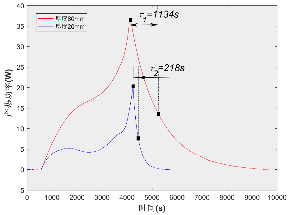由于厚度不同的電池在容量上難以一致,因此本文選用兩款容量不同、大面面積相似、而厚度分別為20mm和80mm的磷酸鐵鋰電池(#1和#2),進行1C恒流放電實驗。理論上放電過程中電池內(nèi)阻隨SOC下降而單調(diào)遞增,所以放電結(jié)束時刻電池產(chǎn)熱功率應(yīng)達(dá)到最大值。但等溫量熱儀測量存在的熱滯后效應(yīng)導(dǎo)致放電結(jié)束后熱功率曲線需要經(jīng)過一定時間才能衰減為零。此處定義放電結(jié)束后功率從峰值衰減至峰值1/e的時間τ為熱滯后時間常數(shù)。τ的大小與電池至加熱片之間非穩(wěn)態(tài)傳熱的時間常數(shù)相關(guān)。如圖2所示,對于厚度為80mm的#2電池,τ?=1134,明顯大于#1電池的計算結(jié)果(τ?=218),說明電池厚度增加會顯著影響電池產(chǎn)熱測量的動態(tài)響應(yīng),這可能是由于電池?zé)崛莺蛢?nèi)部熱阻都與厚度正相關(guān)。
