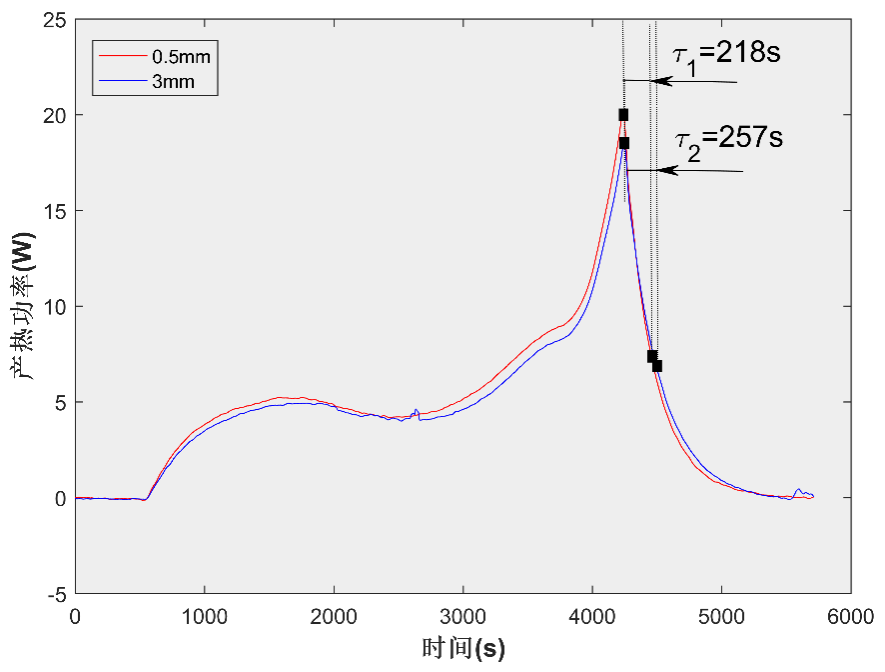 圖2 不同厚度LPF電池1C恒流放電產(chǎn)熱功率曲線