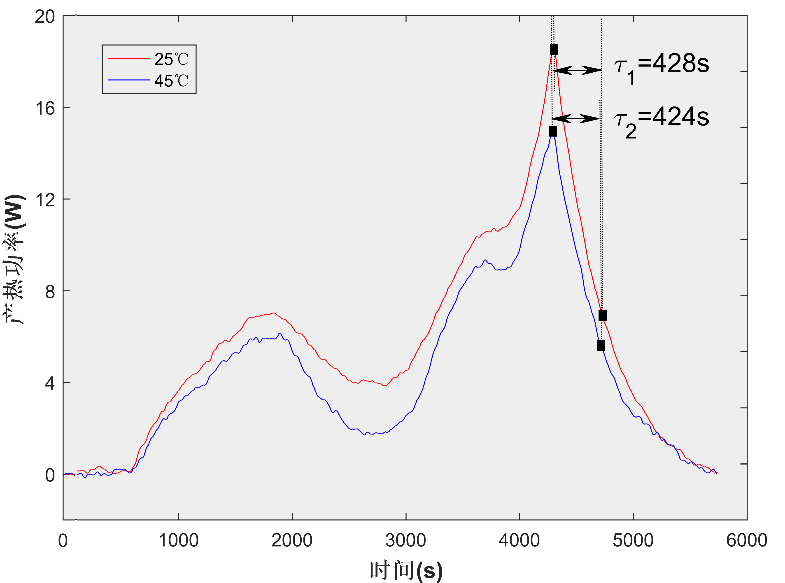 不同工作溫度下電池產(chǎn)熱特性存在差異。如圖4,在45℃條件下#3電池產(chǎn)熱功率略小于25℃下的結(jié)果,但兩者的熱滯后時間常數(shù)基本一致??梢猿醪秸J(rèn)為溫度與熱滯后沒有明顯關(guān)聯(lián)性,這可能是由于溫度小幅度變化對系統(tǒng)傳熱特性幾乎沒有影響。