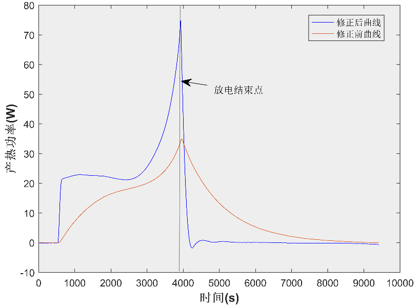 修正前后的產(chǎn)熱功率曲線如圖5所示,可以發(fā)現(xiàn)修正后的曲線幾乎消除了放電結(jié)束后的功率衰減時間,能夠更好地反映電池瞬態(tài)產(chǎn)熱特性。