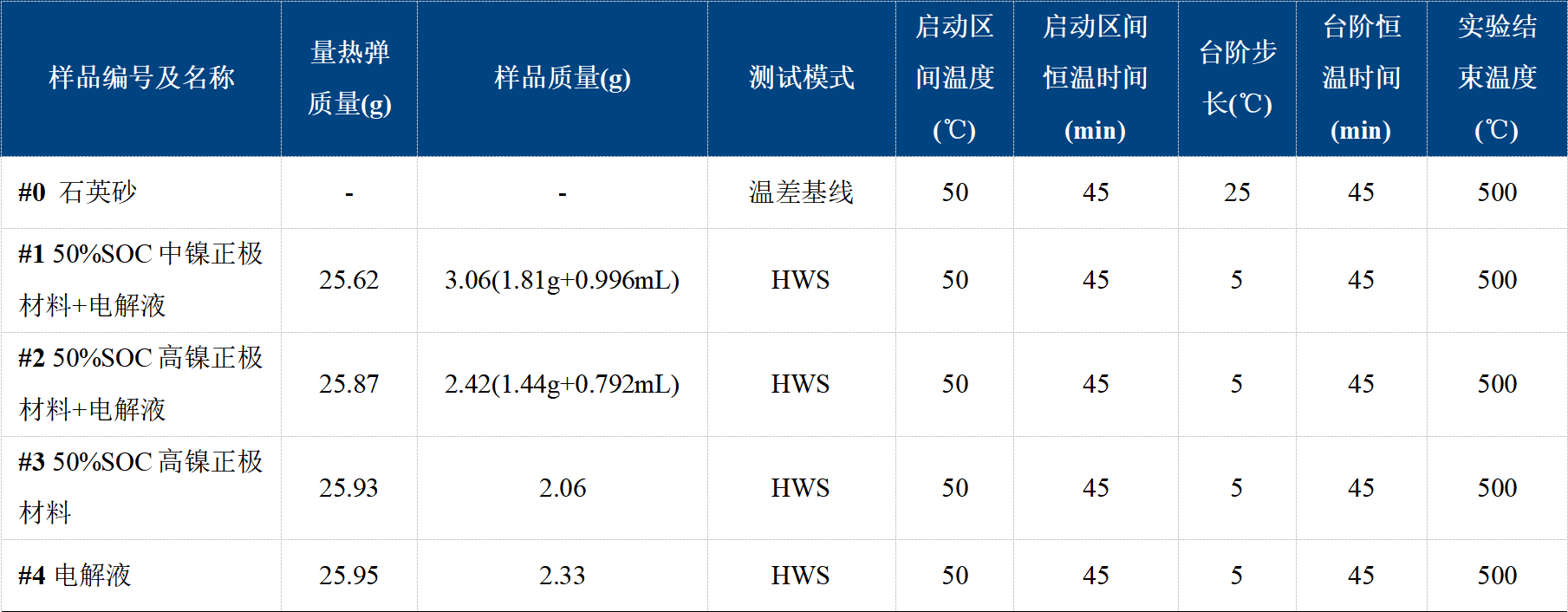 實驗樣品:50%SOC中鎳正極材料、50%SOC高鎳正極材料、電解液(EC+DMC+LiPF6)。