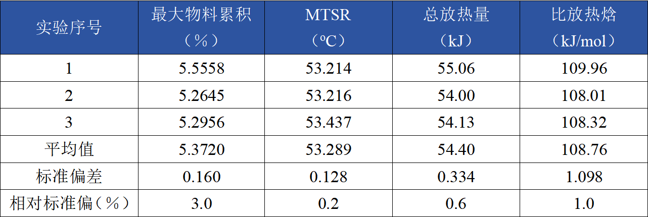 根據(jù)上述數(shù)據(jù),3次丙二酸二乙酯水解實(shí)驗(yàn)的比放熱焓標(biāo)準(zhǔn)偏差為1.0%,證明量熱結(jié)果具有良好的一致性;同時(shí)與文獻(xiàn)對(duì)比,量熱結(jié)果的可信度高。因此,丙二酸二乙酯水解反應(yīng)適合作為標(biāo)準(zhǔn)反應(yīng)體系開(kāi)展量熱儀整體性能評(píng)價(jià)。根據(jù)實(shí)驗(yàn)結(jié)果,建議反應(yīng)比放熱焓參考值為109±2 kJ/mol。
