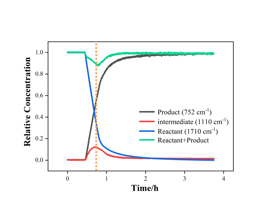 本實驗以2,5-己二酮為底料、滴加乙醇胺的方式進行Paal-Knorr吡咯合成。利用ICPA技術(shù)平臺分子光譜(中紅外)原位檢測功能,可表征反應(yīng)過程中體系紅外吸收光譜隨時間變化。通過對全譜圖進行基線校正和特征峰趨勢分析,可以識別出反應(yīng)體系各組分濃度的變化,其中波數(shù)1110 cm-1處的吸收峰呈現(xiàn)先上升后下降的趨勢,且符合仲胺基上C-N鍵的伸縮振動峰位置,可初步識別為半縮醛胺中間體的特征峰。