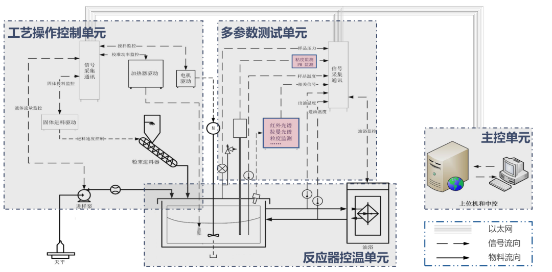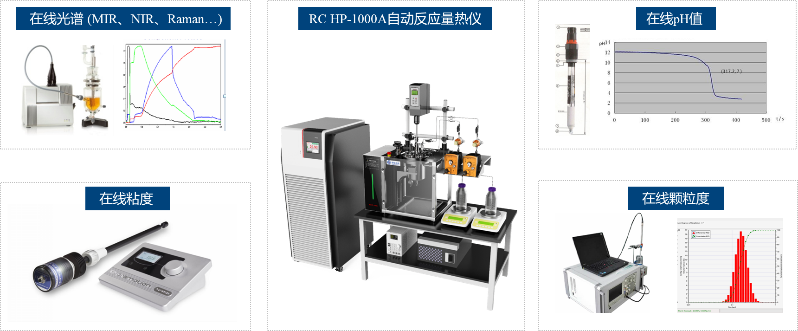 原位檢測與過程分析(以下簡稱ICPA)技術(shù)平臺是以RC HP-1000A型反應(yīng)量熱儀為基礎(chǔ),并搭載在線分子光譜儀、在線粘度計、在線pH計、在線顆粒度檢測儀等探頭式原位檢測儀器的高技術(shù)多參量測控平臺。通過對上述儀器組件在硬件與軟件層面的集成,可實現(xiàn)化學(xué)反應(yīng)工藝過程模擬、多參量測控、數(shù)據(jù)分析與聯(lián)用等功能。其中,ICPA技術(shù)平臺的多參量測控功能可原位采集化學(xué)反應(yīng)過程中體系溫度、壓力、反應(yīng)熱、組分、pH值、粘度和顆粒度等參量的實時數(shù)據(jù),從而高效獲取化學(xué)反應(yīng)特征信息。由于無須進行取樣、樣品前處理等操作,與傳統(tǒng)的離線分析手段相比,ICPA技術(shù)具有不破壞樣品、不引入干擾因素、不丟失過程信息等優(yōu)勢,可用于反應(yīng)機理研究、反應(yīng)風(fēng)險評估、工藝參數(shù)快速優(yōu)化等。另外,由于具備高自動化、高數(shù)據(jù)通量的特點,該技術(shù)是未來實現(xiàn)全自動化實驗室、智能工廠的重要基礎(chǔ)。圖2 原位檢測與過程分析技術(shù)平臺拓撲結(jié)構(gòu)