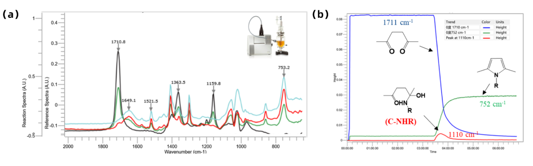 圖4 (a) Paal-Knorr吡咯合成反應(yīng)紅外光譜隨時間變化;(b) 關(guān)鍵特征峰變化趨勢