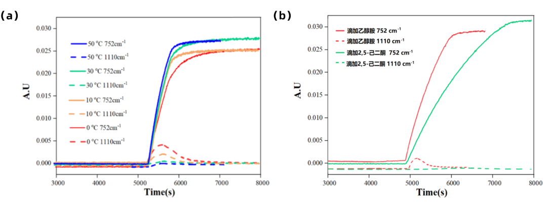 利用特征峰強度變化可對反應(yīng)物、產(chǎn)物和中間體的濃度及相對濃度變化過程進行半定量分析。可以發(fā)現(xiàn),反應(yīng)物和產(chǎn)物的相對濃度之和在1110 cm-1吸收峰出現(xiàn)前后恒等于1,且在反應(yīng)過程中出現(xiàn)的下降趨勢與1110 cm-1吸收峰的變化趨勢相吻合。由此可以確認1110 cm-1是半縮醛胺中間體的特征峰。圖5 反應(yīng)物、產(chǎn)物、中間體相對濃度變化趨勢確認中間體的特征峰之后,可以通過原位采集紅外數(shù)據(jù)高效研究工藝條件對反應(yīng)過程的影響。如圖6所示,提高反應(yīng)溫度會抑制中間體的生成,驗證了半縮醛胺中間體脫水是Paal-Knorr反應(yīng)的決速步驟,溫度對這一步反應(yīng)速率的影響更顯著;另外,投料順序也影響反應(yīng)過程,以乙醇胺為底料、滴加2,5-己二酮的反應(yīng)方式?jīng)]有明顯的中間體生成。