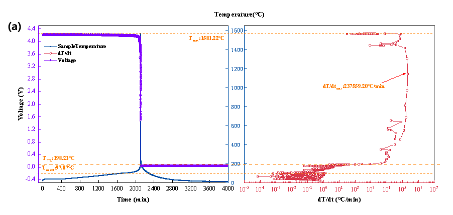 圖2 三元九系電池熱失控(a)溫度&電壓-時間曲線、溫升速率-溫度曲線和(b)附加熱電偶溫度-時間曲線
