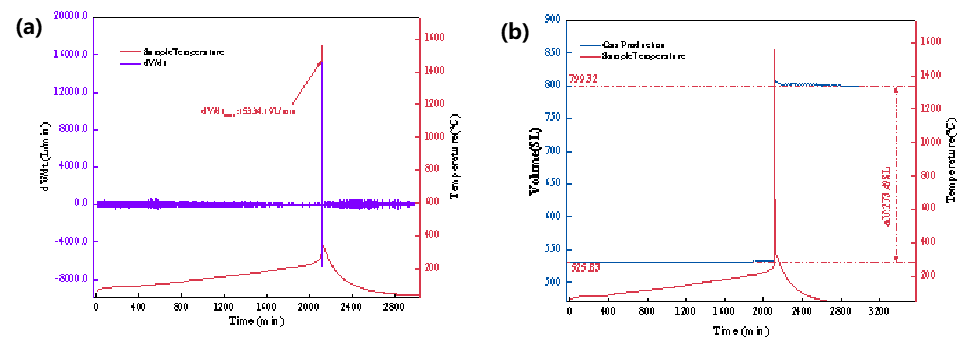 圖3 三元九系電池熱失控(a)產(chǎn)氣速率曲線及(b)產(chǎn)氣量曲線