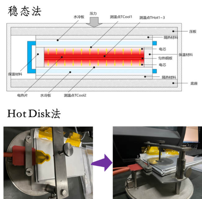 圖1 穩(wěn)態(tài)法實(shí)驗(yàn)裝置示意圖和Hot Disk法實(shí)驗(yàn)測(cè)試圖