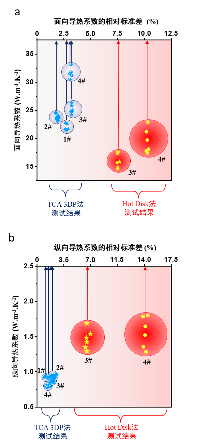 圖3展示了TCA 3DP和Hot Disk兩種方法測(cè)得的軟包鋰離子電池面向和縱向?qū)嵯禂?shù)的測(cè)試結(jié)果。可以看出TCA 3DP法測(cè)得的面向和縱向?qū)嵯禂?shù)數(shù)據(jù)離散程度都較小,其相對(duì)標(biāo)準(zhǔn)差基本上控制在3%以?xún)?nèi),說(shuō)明該方法測(cè)得結(jié)果實(shí)驗(yàn)重復(fù)性較好。而Hot Disk方法測(cè)得的數(shù)據(jù)離散程度較大,例如: 3#和4#電池的面向?qū)嵯禂?shù)相對(duì)標(biāo)準(zhǔn)差分別為7.6%和10.2%,縱向?qū)嵯禂?shù)相對(duì)標(biāo)準(zhǔn)差分別為6.5%和14.1%,遠(yuǎn)高于TCA 3DP方法的測(cè)試結(jié)果。這些數(shù)據(jù)表明TCA 3DP方法在實(shí)驗(yàn)重復(fù)性上較Hot Disk方法好很多。