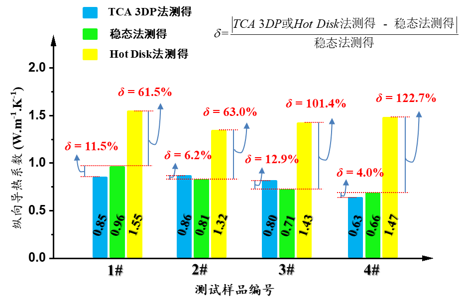 此外,為了驗(yàn)證TCA 3DP和Hot Disk兩種方法的準(zhǔn)確性,我們以穩(wěn)態(tài)法的測(cè)試結(jié)果作為參標(biāo),計(jì)算這兩種方法測(cè)定的縱向?qū)嵯禂?shù)與穩(wěn)態(tài)法的相對(duì)偏差,結(jié)果如圖4所示??梢钥闯?,TCA 3DP法測(cè)得的結(jié)果與穩(wěn)態(tài)法更為接近,相對(duì)偏差在4% ~ 11.5%之間,而Hot Disk法測(cè)得的結(jié)果與穩(wěn)態(tài)法差別較大,相對(duì)偏差在61.5% ~ 122.7%之間。因此,我們可以得出結(jié)論相比于Hot Disk法,TCA 3DP法測(cè)得的導(dǎo)熱系數(shù)更為準(zhǔn)確。