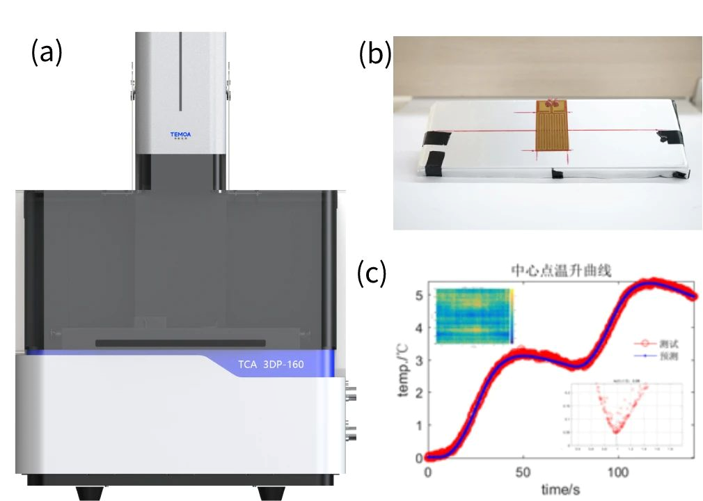 圖1 (a) 3D熱物性分析儀;(b) 實驗用軟包電池樣品;(c) 3D熱物性分析儀導(dǎo)熱系數(shù)數(shù)據(jù)反演分析過程