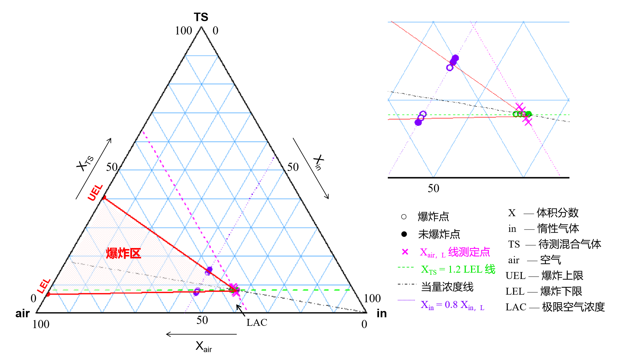 極限氧濃度可利用三元圖進(jìn)行分析,根據(jù)GB/T 38301-2019,當(dāng)UEL≤ 0.8 × (100-Xair,L),適用簡易實驗程序。