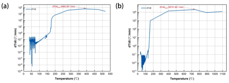 根據(jù)測試數(shù)據(jù),9系三元鋰電池自放熱起始溫度Tonset為86.78度,熱失控起始溫度TTR為202.76度,電池電壓的驟降點與TTR溫度基本一致。電池到達TTR之后具有極高的溫升速率,2s內(nèi)電池表面溫度達到熱失控最高溫度1109℃,最大升溫速率約為48900℃/min。與9系鋰電池相比,如圖2所示,6系電池從TTR到達Tmax需要70s,最大升溫速率約為6500℃/min;8系電池需要5s,最大升溫速率約為20600℃/min,說明隨著鎳含量的上升,電池?zé)崾Э貏×页潭炔粩嗵岣摺?