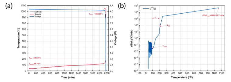 圖1 9系三元鋰電池?zé)崾Э?a)溫升及電壓曲線及(b)溫升速率-溫度曲線