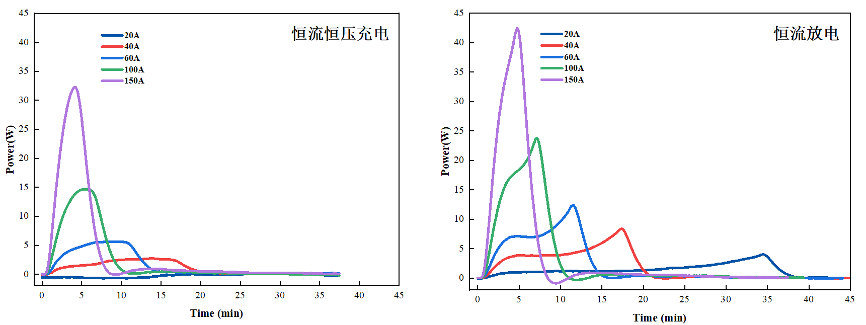 圖3 鋰離子電容器恒流恒壓充電(左)和恒流放電(右)放熱功率曲線
