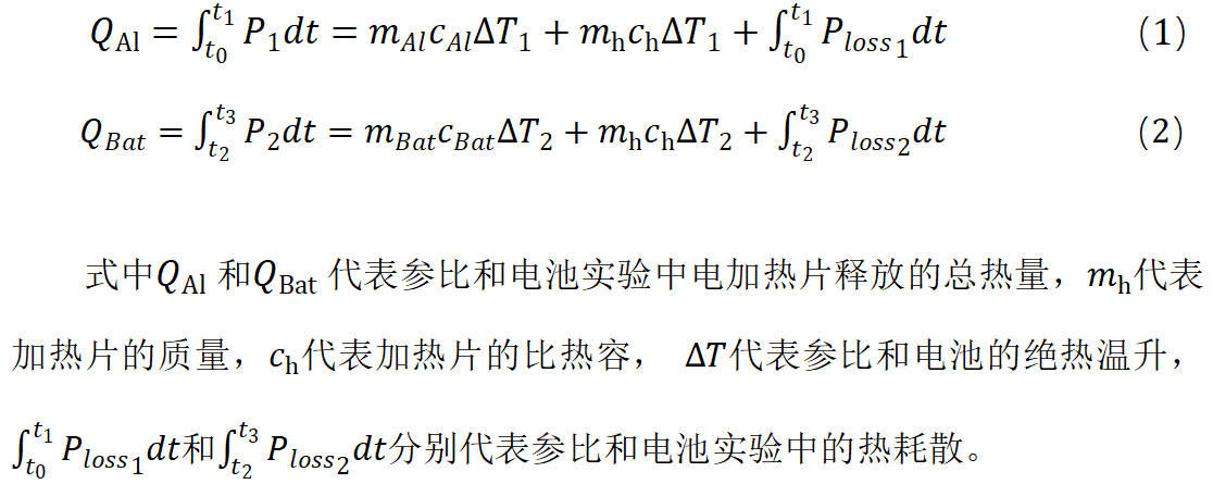 比熱容測試基于差示絕熱追蹤的原理。簡而言之,在量熱儀的絕熱追蹤工作模式下,利用柔性電加熱片對鋰電池與已知比熱容的標(biāo)準(zhǔn)樣品(通常為鋁質(zhì))進(jìn)行加熱,并盡量控制樣品與參比的升溫歷程一致。根據(jù)式(1)和式(2),利用參比可計(jì)算和扣除由于測試過程中實(shí)驗(yàn)環(huán)境難以達(dá)到完全理想絕熱而耗散至環(huán)境中的熱量,從而精確測量鋰電池比熱容。