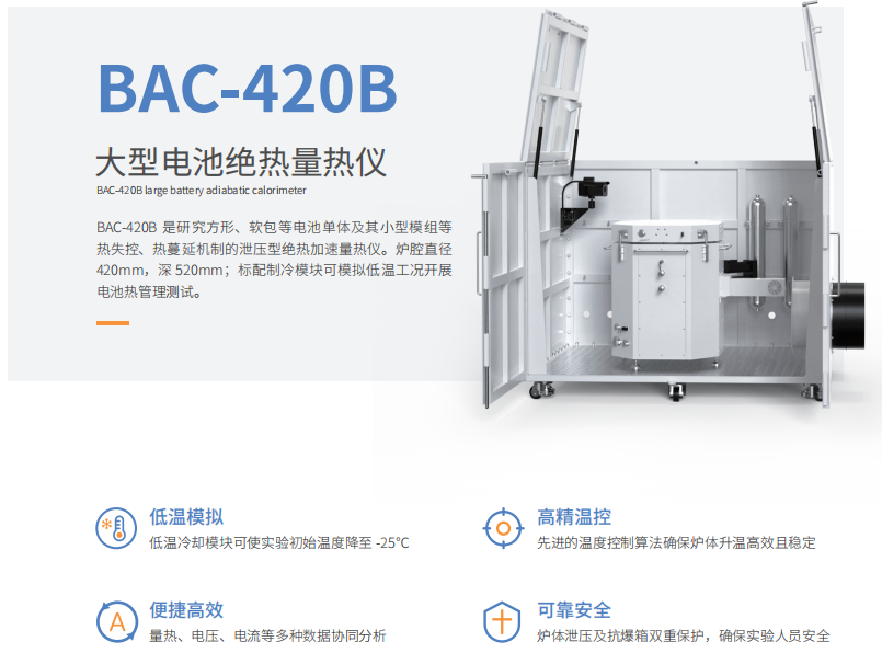 利用BAC-420B大型電池絕熱量熱儀可以測量電池在寬溫域內(nèi)的比熱容數(shù)據(jù),能夠幫助研究人員更全面地進(jìn)行熱管理設(shè)計(jì),優(yōu)化電池系統(tǒng)在高低溫工況下的性能。