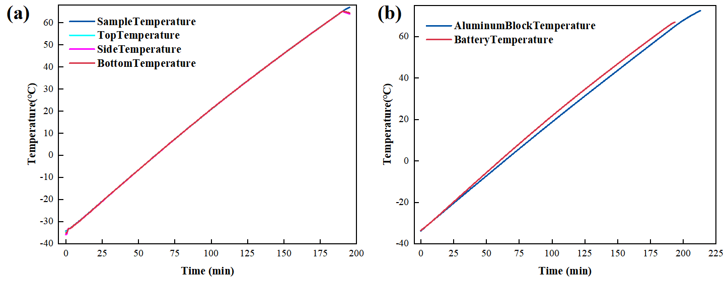如圖3(a)所示,實(shí)驗(yàn)過程中量熱腔爐體溫度與樣品溫度始終保持緊密貼合,溫差低于±0.2℃。準(zhǔn)絕熱測試環(huán)境封閉了樣品的熱耗散,能夠顯著降低難以準(zhǔn)確測量的不確定項(xiàng)所引入的系統(tǒng)誤差。圖3(b)為電池及參比在比熱容實(shí)驗(yàn)中的溫升曲線,由于兩者熱容存在差異性,因此相同加熱功率下溫升速率不完全一致。圖3(c)顯示了測定得到的電池變溫比熱容曲線(每5℃平均),可以發(fā)現(xiàn)隨著溫度上升,比熱容呈單調(diào)上升趨勢。同時(shí)可計(jì)算得到電池在-30℃到65℃范圍內(nèi)的平均比熱容為1024.64kJ/(kg*℃)。