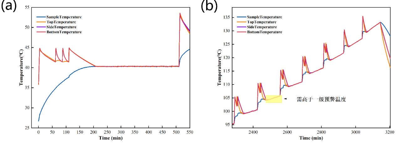 圖5 GB/T 36276-2023絕熱溫升特性試驗升溫曲線局部特征:(a)首臺階;(b)速率檢測臺階