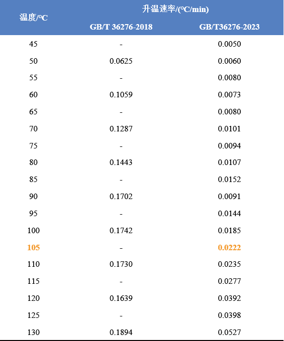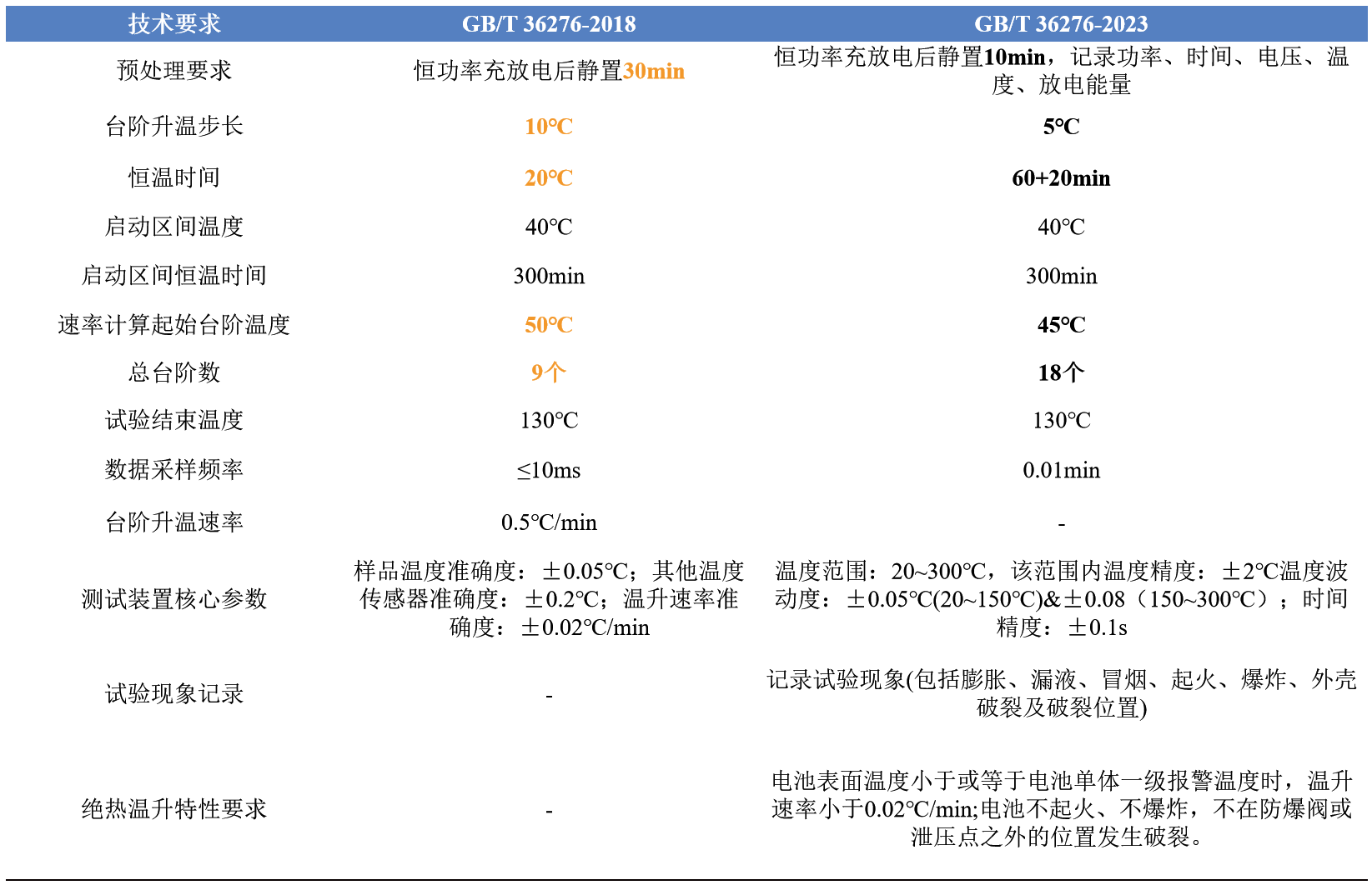 GB/T 36276-2023《電力儲能用鋰離子電池》與GB/T 36276-2018版標準的絕熱溫升特性試驗要求對比: