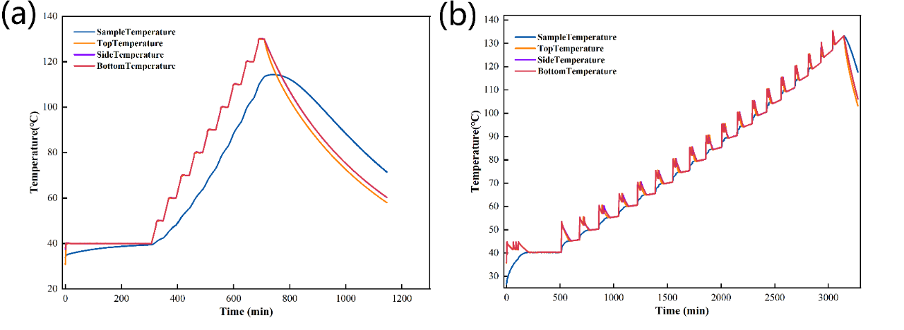 圖3 (a)GB/T 36276-2018和(b)GB/T 36276-2023絕熱溫升特性試驗電池升溫曲線