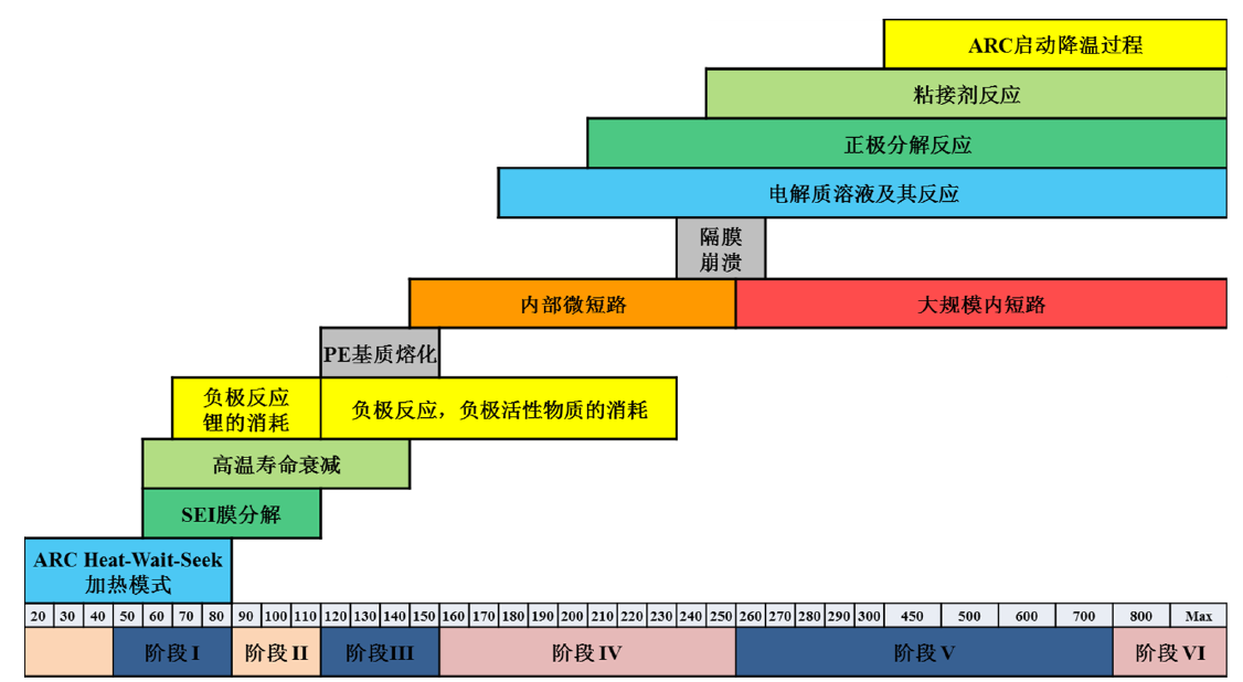 圖1 絕熱熱失控測試各個(gè)階段發(fā)生的化學(xué)反應(yīng)情況