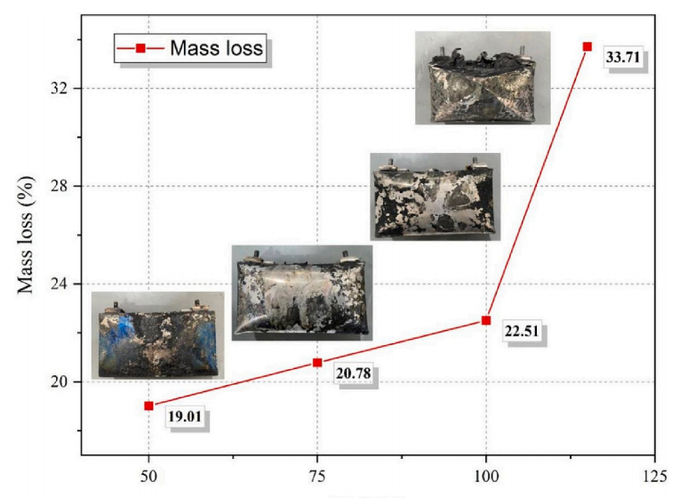 對熱失控后的電池殘骸進(jìn)行稱量,可計(jì)算質(zhì)量損失率。該方法同樣能夠判斷電池?zé)崾Э貏×页潭?。從圖2可以發(fā)現(xiàn),SOC越高,電池的質(zhì)量損失率越大,這是由于高SOC的電池在熱失控過程中通常伴隨更強(qiáng)烈的電池材料噴發(fā)、起火和燃爆現(xiàn)象。