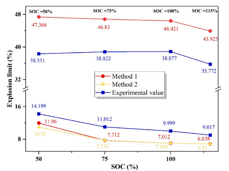 圖5 不同SOC電池?zé)崾Э睾髿怏w爆炸上下限