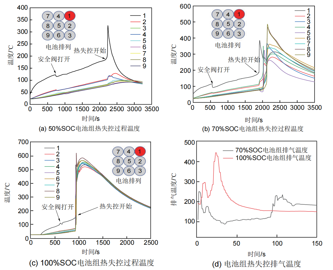 在實(shí)際應(yīng)用中,鋰電池通常會(huì)以電池組的形式進(jìn)行使用,此時(shí)若有一個(gè)電池發(fā)生熱失控,可能逐步引發(fā)周圍電池的熱失控,從而出現(xiàn)熱蔓延現(xiàn)象。本文引用中國民航大學(xué)的張青松課題組的研究成果[2],觀察圖7可發(fā)現(xiàn),50%SOC的電池組除1號電池以外,其余電池均未發(fā)生熱失控;而70%及100%電池組中的所有電池均相繼發(fā)生了熱失控。其中100%SOC 條件下,熱蔓延速度、電池?zé)崾Э刈罡邷囟群碗姵亟M排氣溫度均高于70%SOC,這也充分說明滿電電池?zé)o論是熱失控劇烈程度還是發(fā)生熱蔓延的概率都明顯高于空電狀態(tài)電池。
