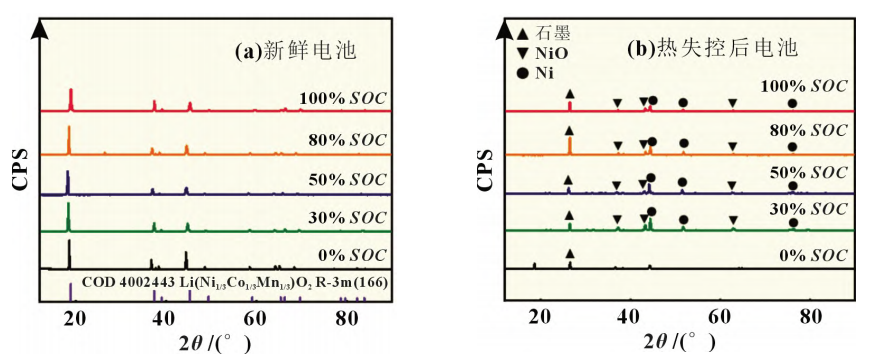 以上研究說明高電量更容易導(dǎo)致電池?zé)崾Э氐陌l(fā)生,且熱失控劇烈程度會(huì)更高、燃爆現(xiàn)象更明顯。上?;ぱ芯吭簝Φ马g等[3]研究認(rèn)為正極材料的熱分解是電池?zé)崾Э氐闹匾襟E,也是導(dǎo)致高電量電芯更易失控的原因之一,為此他們使用了XRD對熱失控前后正極材料的晶體結(jié)構(gòu)進(jìn)行了分析。