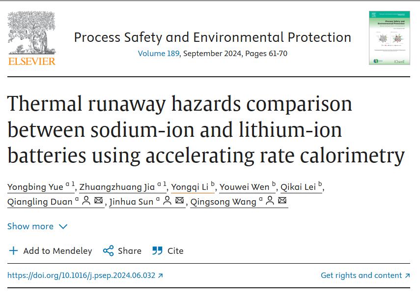 中國科學(xué)技術(shù)大學(xué)王青松教授團(tuán)隊(duì)在Process Safety and Environmental Protection(IF:6.9)發(fā)表題為Thermal runaway hazards comparison between sodium-ion and lithium-ion batteries using accelerating rate calorimetry論文,該成果由中國科學(xué)技術(shù)大學(xué)火災(zāi)科學(xué)國家重點(diǎn)實(shí)驗(yàn)室和中國南方電網(wǎng)發(fā)電有限公司儲能研究所等機(jī)構(gòu)聯(lián)合支持。