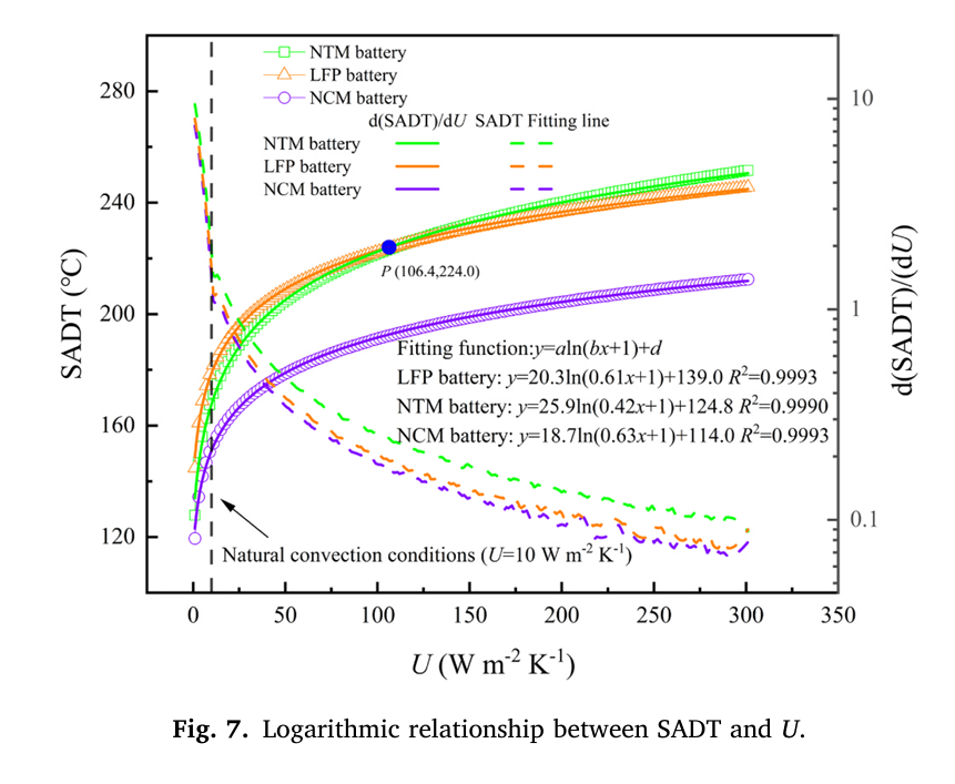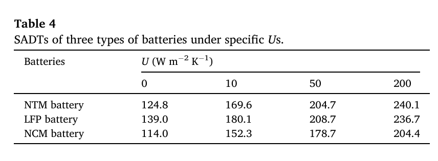 3. 在自然對流條件下,當(dāng)儲存溫度超過169.6 ℃時,完全充電的NTM電池會自燃。在電池儲存和運(yùn)輸過程中增加系統(tǒng)表面?zhèn)鳠嵯禂?shù)U已被證明可以顯著提高NTM電池相對于LFP和NCM電池的安全性。
