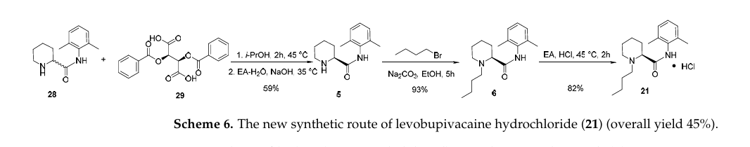 鹽酸左布比卡因(21),化學(xué)名為(2S)-1 - 丁基 - N-(2,6 - 二甲基苯基)-2 - 哌啶甲酰胺鹽酸鹽,是一種酰胺類局部麻醉藥。它是鹽酸布比卡因的S - 對(duì)映體,在外科和產(chǎn)科手術(shù)的局部麻醉以及術(shù)后疼痛管理中廣泛應(yīng)用于臨床。
