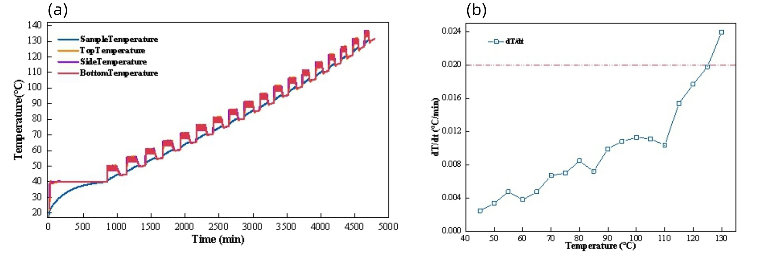 圖3 #01電池絕熱溫升特性試驗(yàn)(a)電池升溫曲線和(b)溫升速率-溫度曲線