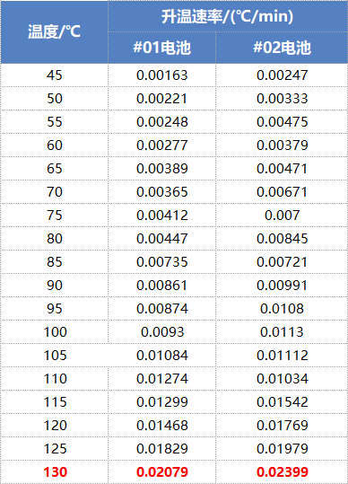 當(dāng)溫度達(dá)到130℃時(shí),兩個(gè)模組的臺(tái)階溫升速率均達(dá)到0.02℃/min(表3),此時(shí)判定模組中單體電池的自放熱開始;因此依據(jù)該參數(shù)設(shè)定該款模組的一級(jí)安全報(bào)警溫度為130℃,能對(duì)儲(chǔ)能系統(tǒng)做出有效的預(yù)警。