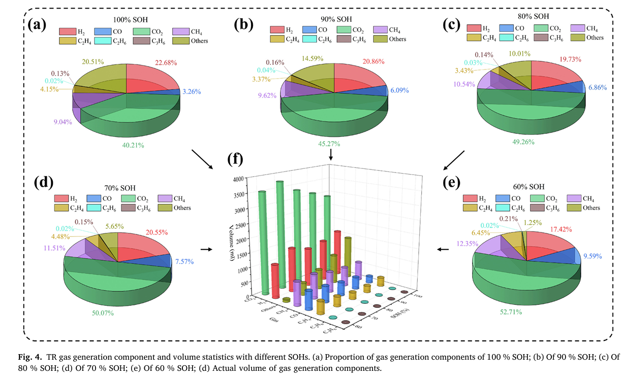 本研究通過定性與定量分析,系統(tǒng)闡述了低溫老化條件下不同SOH鋰離子電池的熱失控產(chǎn)氣特性與噴射火行為特征。實(shí)驗(yàn)獲取了包括最高溫度、觸發(fā)時(shí)間、產(chǎn)氣成分、產(chǎn)氣量、爆炸風(fēng)險(xiǎn)指數(shù)及噴射火擴(kuò)散面積等關(guān)鍵參數(shù),全面剖析了不同SOH鋰離子電池的安全性能表現(xiàn)。上述研究成果將為提升電池在儲(chǔ)能場(chǎng)景及梯次利用過程中的安全性提供重要理論依據(jù)與技術(shù)支撐。