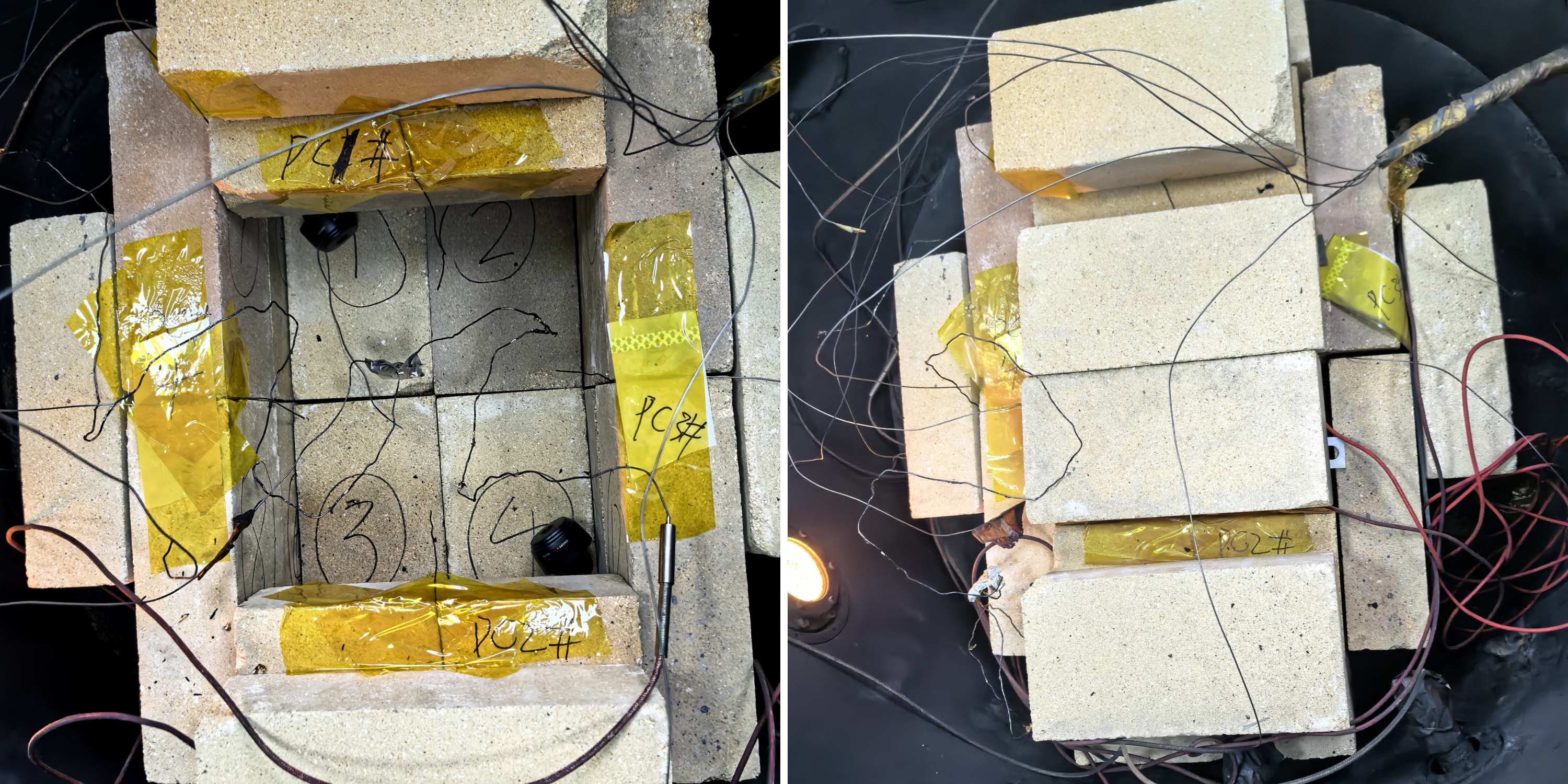 在實驗過程中,磚塊將會如圖3所示進行固定,保證磚塊將電池完全包裹,從而全面的評價電池爆炸的危害。并在內(nèi)部加裝了攝像頭與熱電偶進行監(jiān)測。