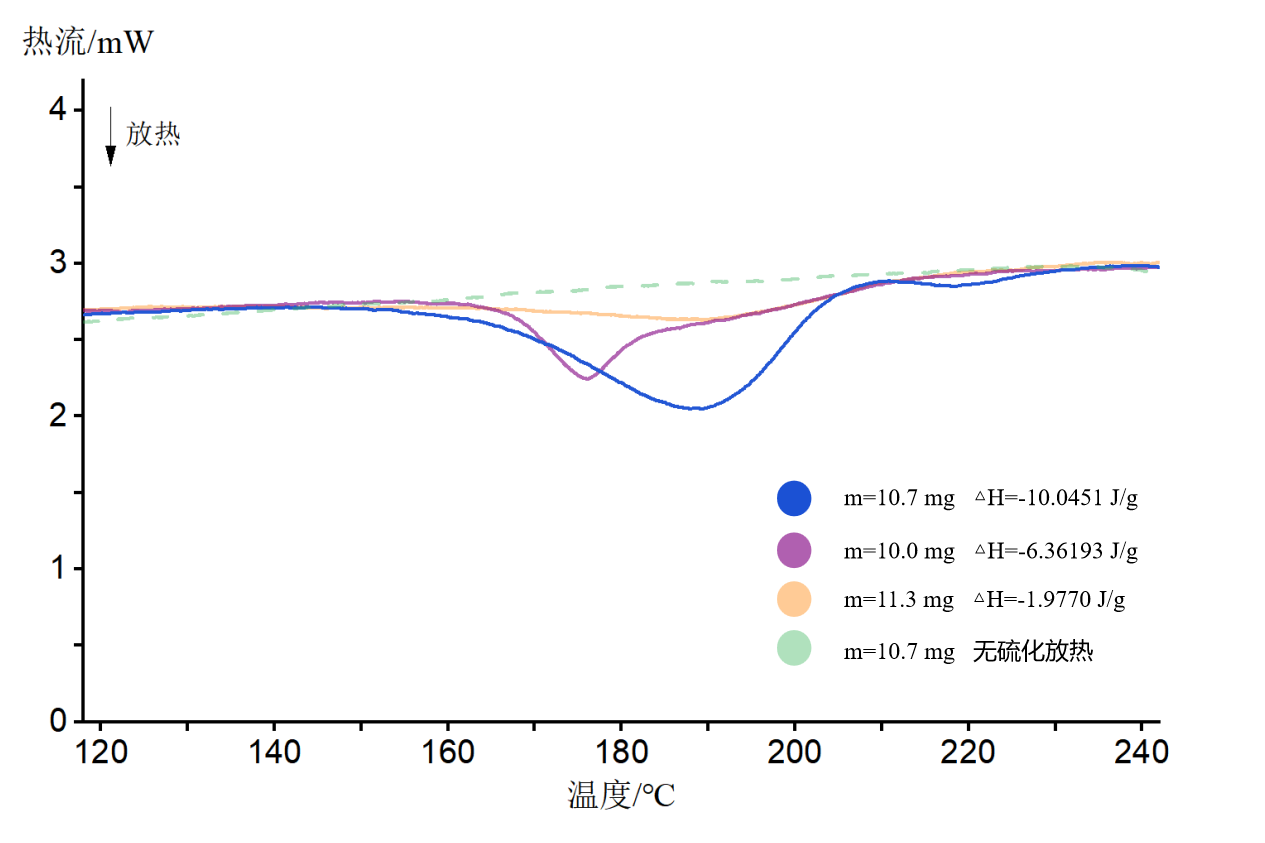 橡膠材料的硫化程度隨硫化時間變化呈現差異。未完全硫化橡膠的DSC測試中可觀察到交聯反應產生的放熱峰,該放熱峰在首次測試后消失。因此,通過定量分析首次DSC曲線中硫化放熱峰的峰面積(對應熱焓值),可有效評估橡膠的硫化程度,進而指導確定合理的硫化時間,以獲得具有最佳性能的產品。