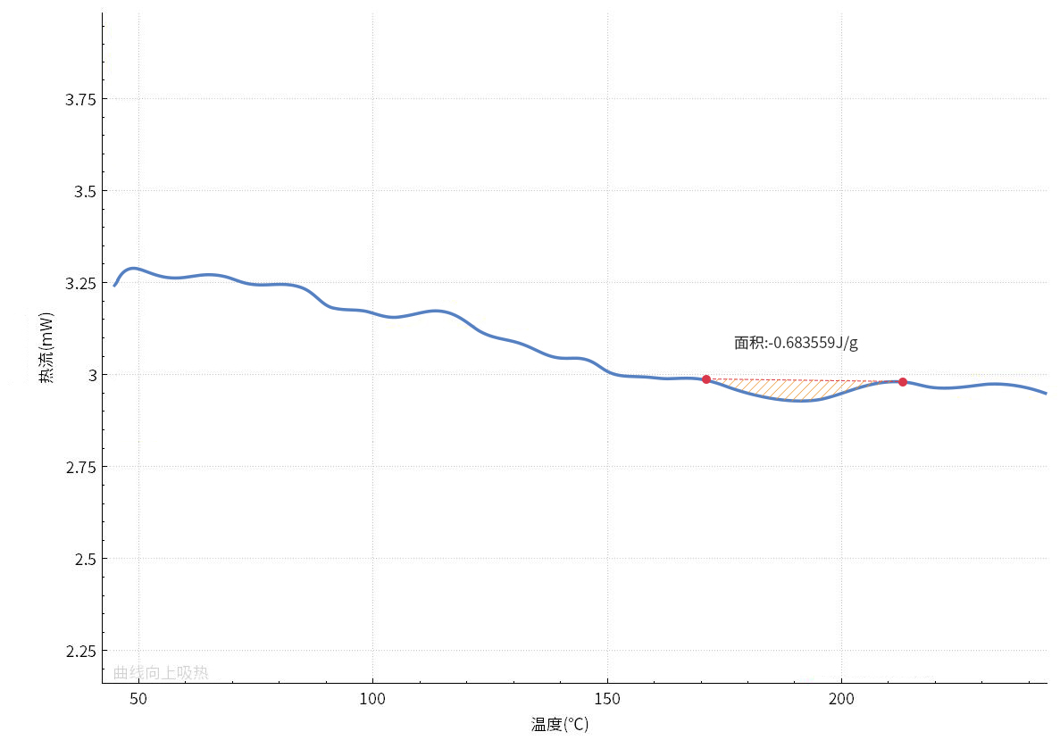 測試結果表明,橡膠硫化過程的熱釋放效應較為微弱,對測試儀器的靈敏度與分辨率等核心性能指標提出了更高要求。在此研究中,DSC-40A憑借其卓越的微弱信號檢測能力,成功捕捉到低至0.6836 J/g的微小放熱信號。通過其配套專用分析軟件,可清晰解析該微弱放熱過程的關鍵參數,如熱焓值(詳見圖3),實現了對硫化反應的精確表征,這一結果有力印證了DSC-40A的高性能表現。