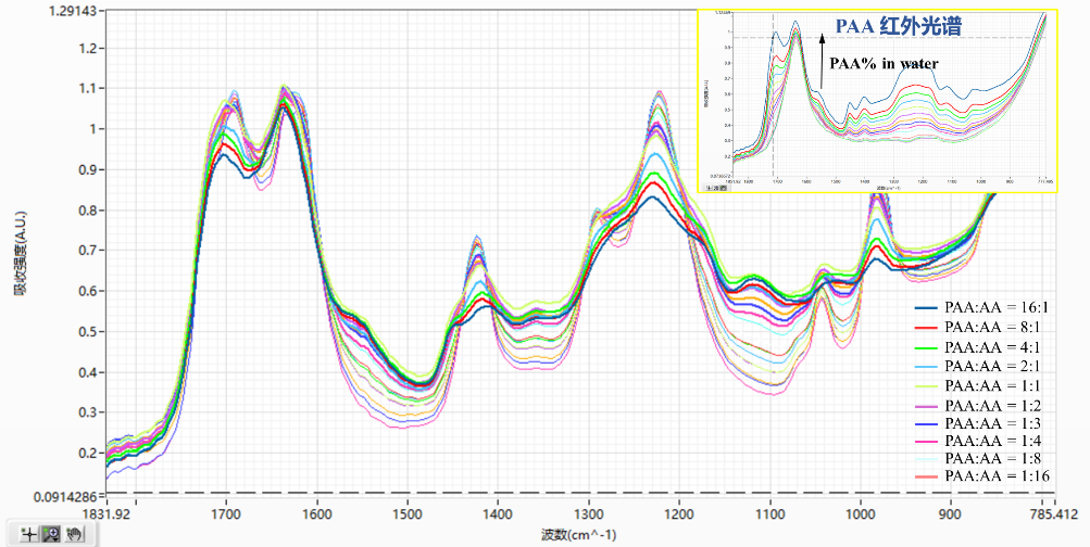 圖2 丙烯酸/PAA混合溶液紅外吸收光譜(丙烯酸/PAA質(zhì)量比:1:16-16:1)