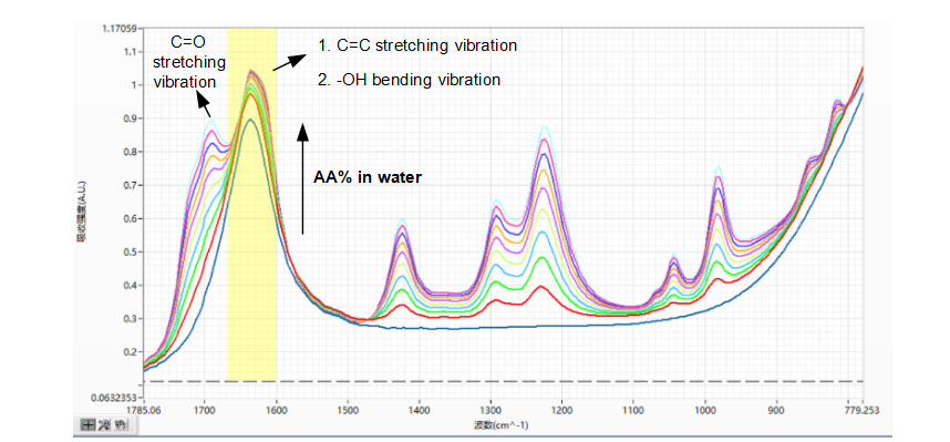 原位衰減全反射傅里葉變換紅外光譜(in-situ ATR-FTIR)目前已成功應(yīng)用于自由基聚合、陰離子聚合和陽(yáng)離子聚合等聚合反應(yīng)研究,主要通過(guò)測(cè)定反應(yīng)過(guò)程中碳碳雙鍵等特征基團(tuán)的吸光度變化建立定量模型,計(jì)算單體濃度和轉(zhuǎn)化率[1,5,6]。然而該方法并不適用于半間歇式水相聚合體系,以聚丙烯酸(PAA)的水相溶液聚合反應(yīng)為例,為控制反應(yīng)平穩(wěn)進(jìn)行,工業(yè)生產(chǎn)中通常會(huì)將部分丙烯酸單體、引發(fā)劑和鏈轉(zhuǎn)移劑溶液同時(shí)以滴加方式投入聚合釜內(nèi)。如圖1所示,水中的羥基在1650 cm-1附近的紅外吸收峰強(qiáng)度較大,而碳碳雙鍵在臨近位置的吸收峰相對(duì)較弱,由于半間歇反應(yīng)過(guò)程中水的濃度也會(huì)相應(yīng)變化,將水的純譜作為背景直接進(jìn)行扣除將顯著影響單體紅外定量的準(zhǔn)確性。