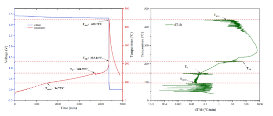 可以直接使用密閉式ARC如BAC-800B和BAC-1000A,或者使用泄壓式ARC如BAC-420A并搭配耐壓密封測試罐體,測試電池?zé)崾Э剡^程中的產(chǎn)氣變化。使用BAC-420A對160Ah的磷酸鐵鋰電池進(jìn)行的熱失控產(chǎn)氣實驗結(jié)果如圖5所示,通過數(shù)據(jù)曲線可以對熱失控過程的溫度和壓力變化進(jìn)行同步分析,也可以結(jié)合理想氣體狀態(tài)方程計算反應(yīng)過程的產(chǎn)氣速率。需要注意的是,泄壓式ARC搭配密封測試罐進(jìn)行熱失控產(chǎn)氣實驗時,由于密封測試罐給實驗樣品引入熱惰性因子,會使“HWS模式”測試得到的Tonset偏高。