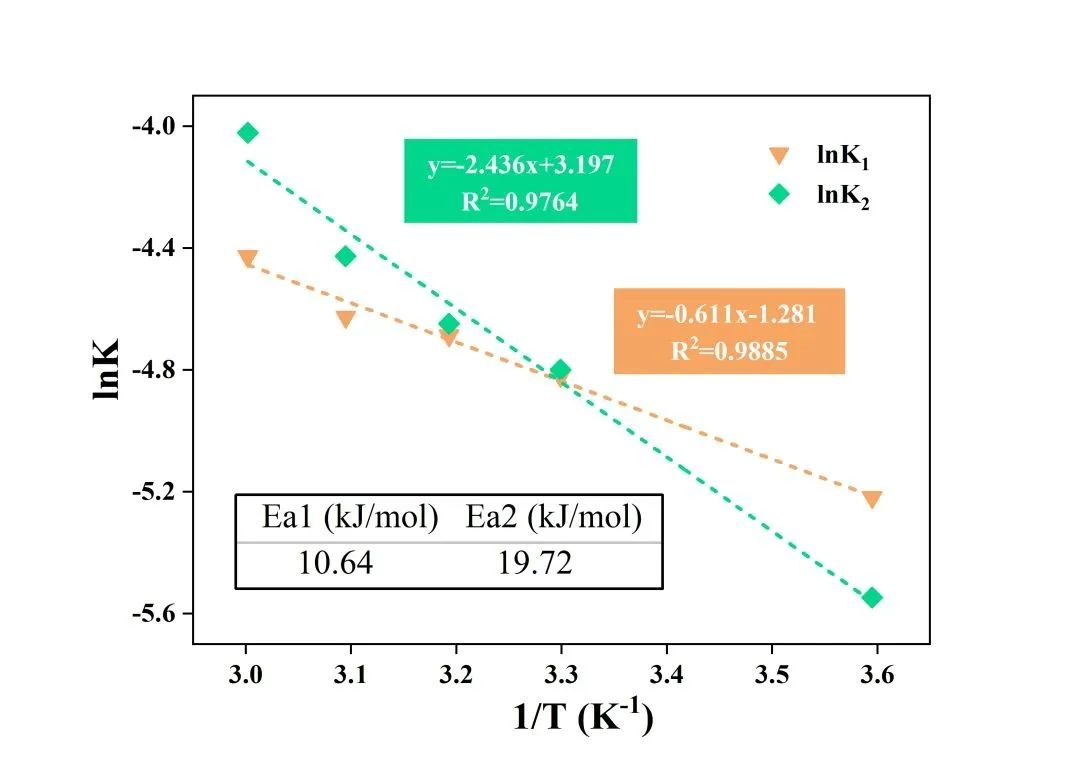 進(jìn)一步根據(jù)阿倫尼烏斯方程lnk=lnA-Ea/RT對lnk與1/T進(jìn)行線性擬合,可計算得到表觀活化能Ea1和Ea2,結(jié)果如下圖所示: